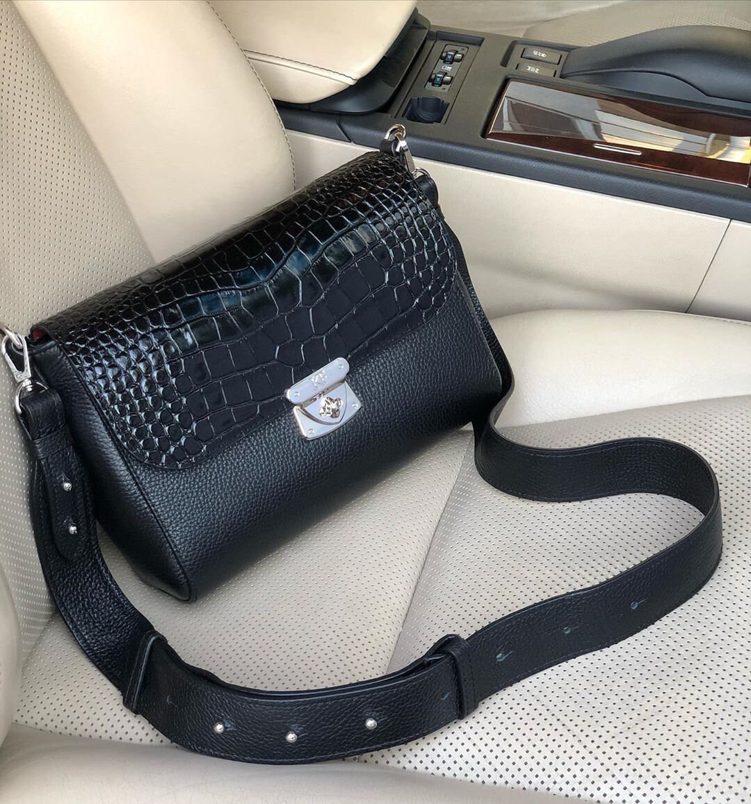 Black genuine leather woman shoulder bag from ukrainian designer Katerina Fox. This elegant, versatile and practical bag. It is ideal for the office, for walks, for a party. The valve is made of genuine leather crocodile print. Inside the bag is one large compartment and a convenient zippered pocket for small items, closes the bag on the clasp. Bag KF comfortable to wear on the shoulder or across the shoulder, the handle length is adjustable. The bag is comfortable to wear on the shoulder or across the shoulder, the handle length is adjustable. If you are planning to buy excellent leather bag at an affordable price, this handbag is the right choice!