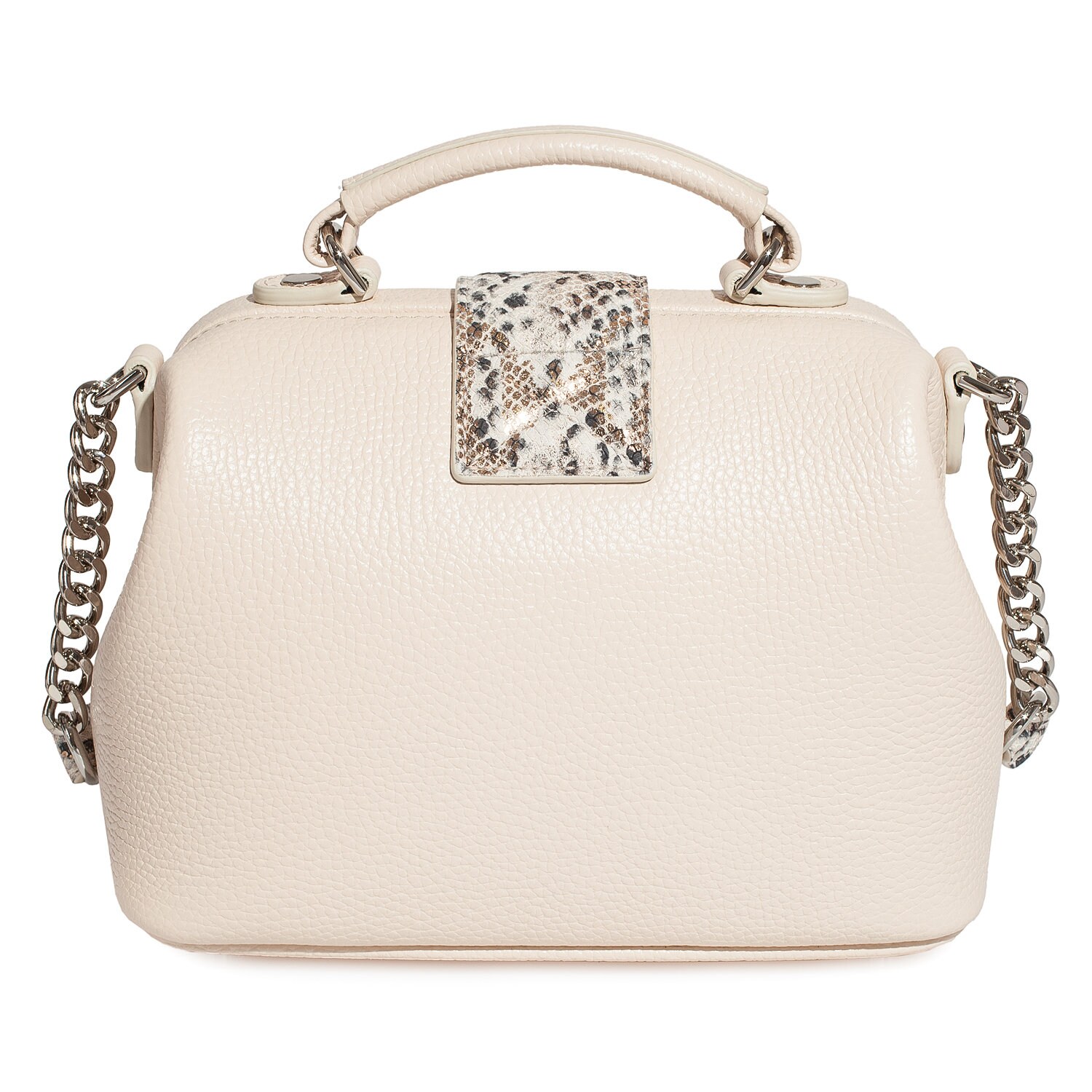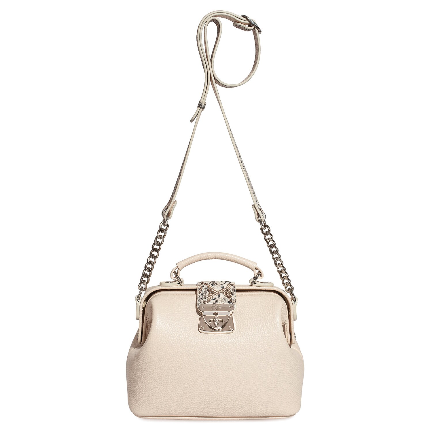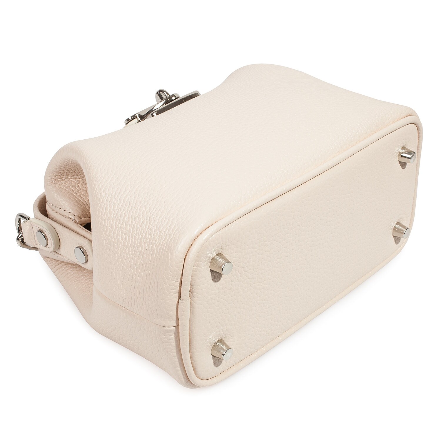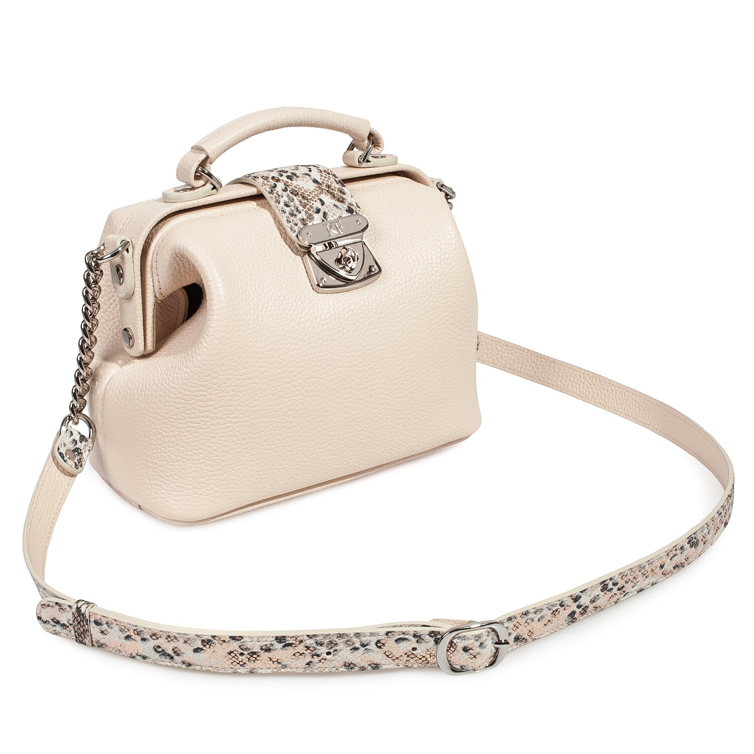 Light beige genuine leather handbag from ukrainian designer Katerina Fox. This model is designed for women who appreciate the sleek design combined with functionality and comfort. High-quality and reliable hardware ensure long service bags. The internal space of a bag is equipped with one spacious compartment and two patch-pockets and one zipper pocket. The bag is closed with a clasp. The bottom of the bag is protected with metal legs. There is a long handle that allows you to wear the bag on the shoulder. The kit also includes a storage bag.