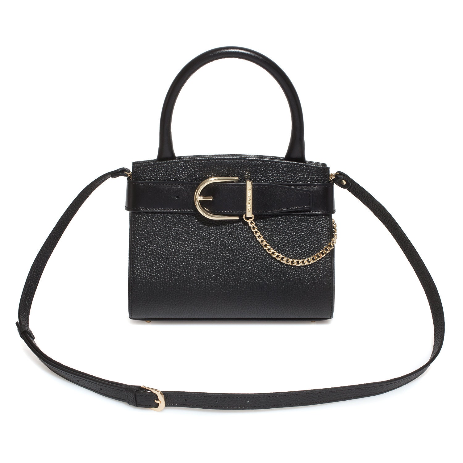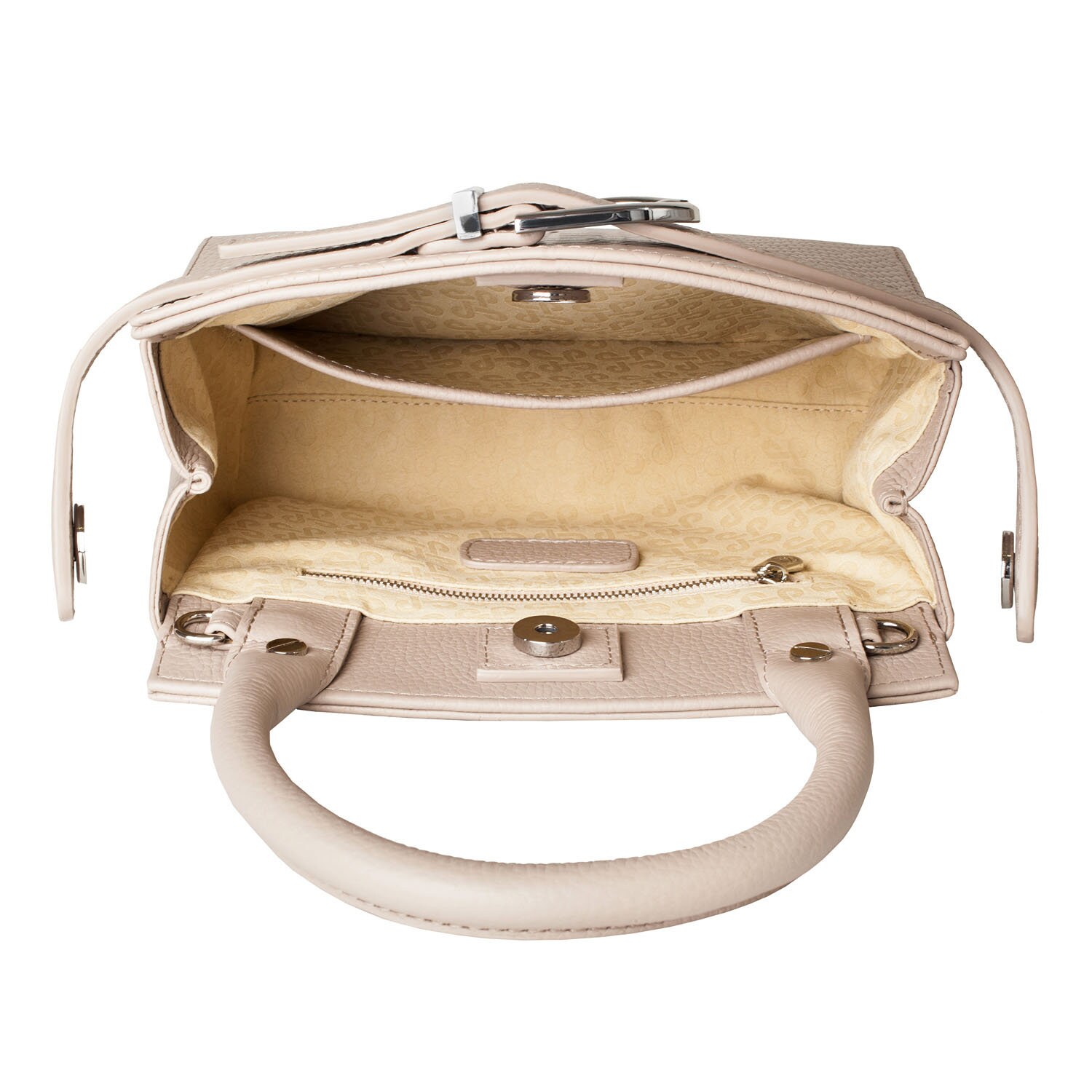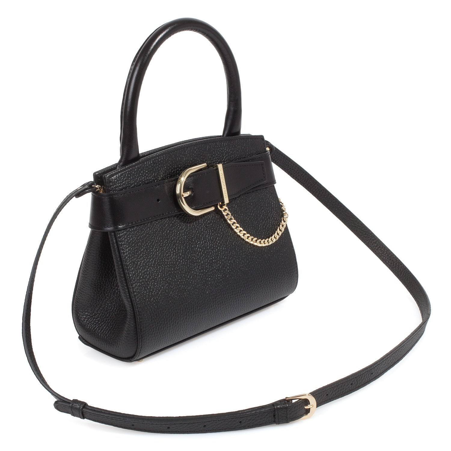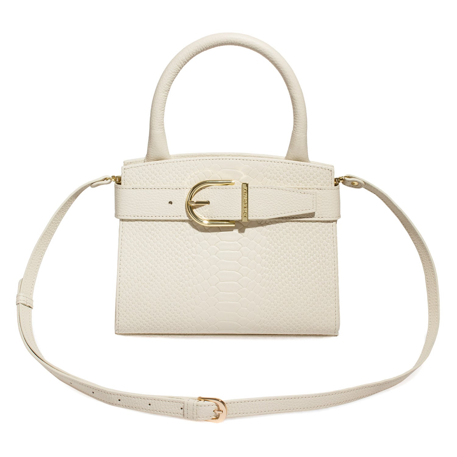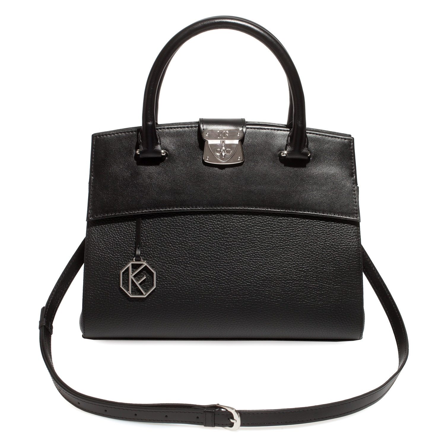 Women's leather bag made of genuine leather, hardware with galvanic coating and microfiber lining. The internal space of a bag is equipped with three compartments, one compartment and two side pockets, one with a zipper. §³loses with 3 magnet buttons. The bottom of the bag is protected with metal legs. There is a long handle that allows you to wear the bag on the shoulder. The kit also includes a storage bag.